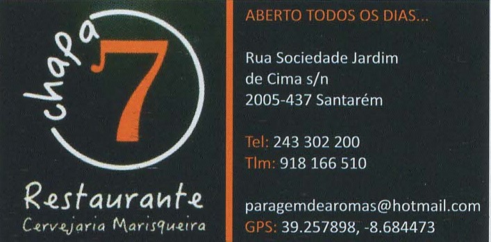 Chapa 7 – Restaurante Cervejaria Marisqueira Restauração Santarém Rua Sociedade Jardim de Cima S/N 2005-437 Contact Info 243 302 200 / 918 166 510 paragemdearomas@hotmail.com