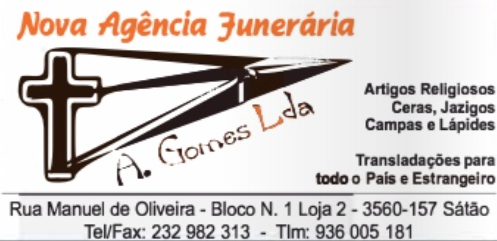 Nova Agência Funerária – A. Gomes, Lda. Serviços Viseu Rua Manuel de Oliveira - Bloco Nr.1 - Loja 2 3560-157 Sátão Contact Info 232 982 313 / 936 005 181 funeraria.a.gomes.lda@hotmail.com